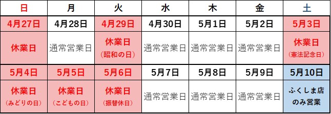 ゴールデンウィーク期間中の共済ショップ営業日をお知らせいたします。