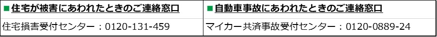 なお、住宅災害にあわれたときのご連絡窓口「住宅損害受付センター」と、自動車事故にあわれたときのご連絡窓口 「マイカー共済事故受付センター」の電話受付は、ゴールデンウィークも24時間受付いたします。