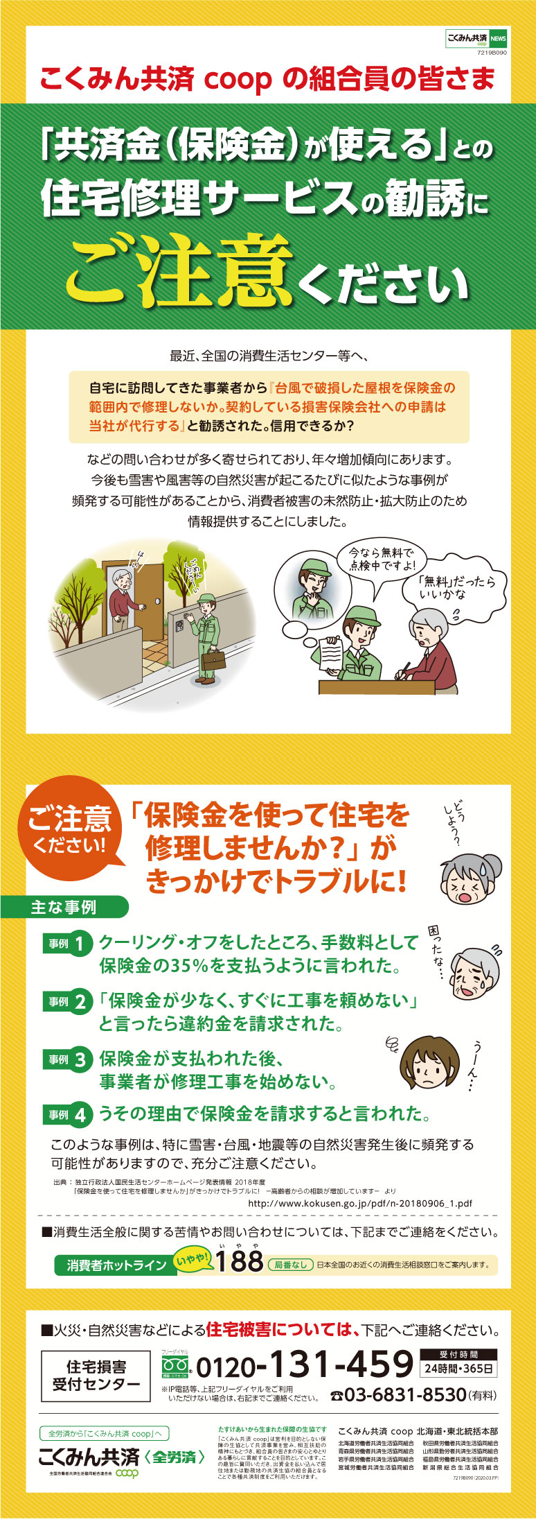 こくみん共済 coop ではこのようなことは一切行っておりません。これから雪解けが進み暖かくなり、