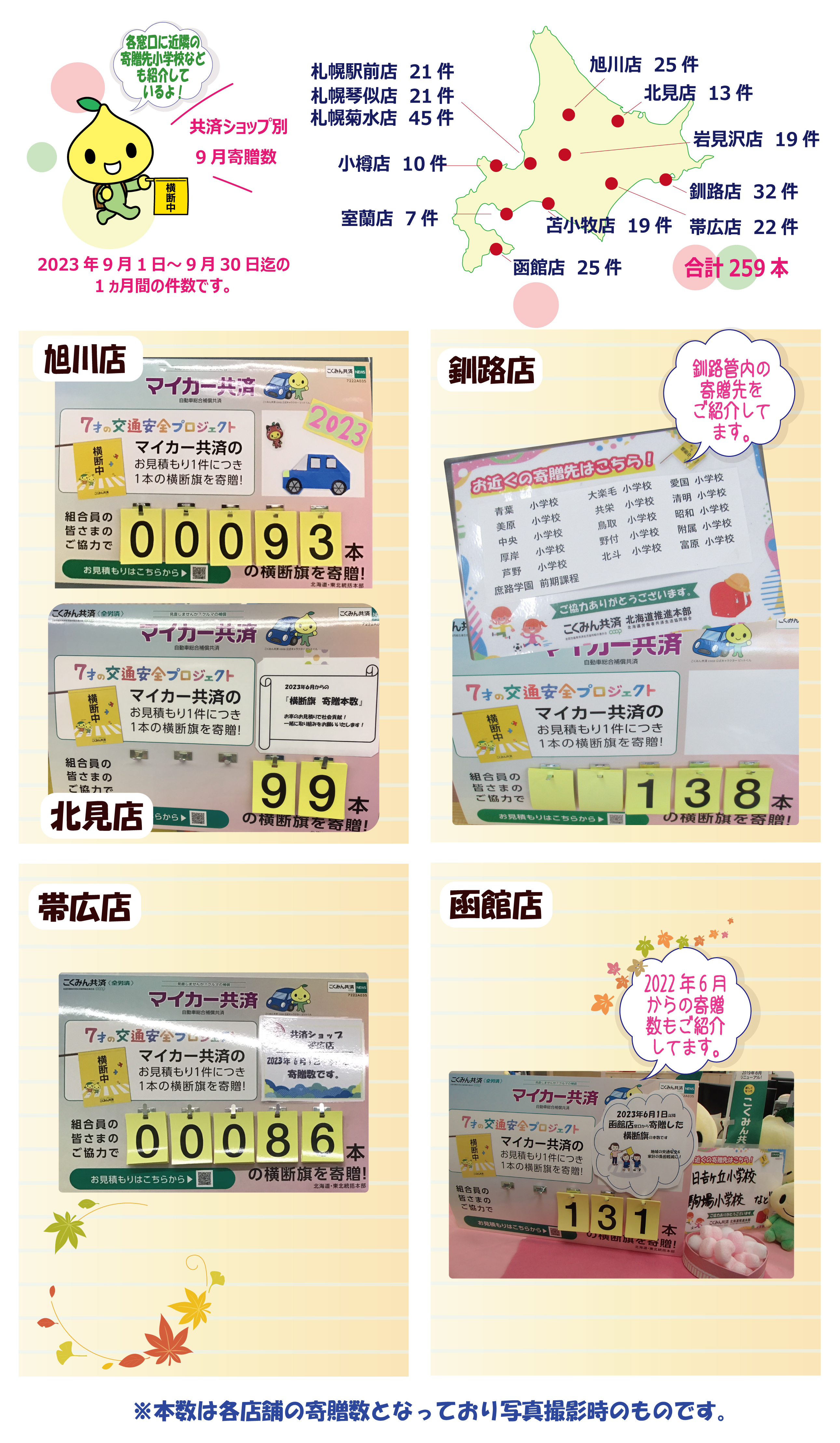 道内共済ショップ『7才の交通安全プロジェクト』取り組みのご紹介 9月寄贈数。