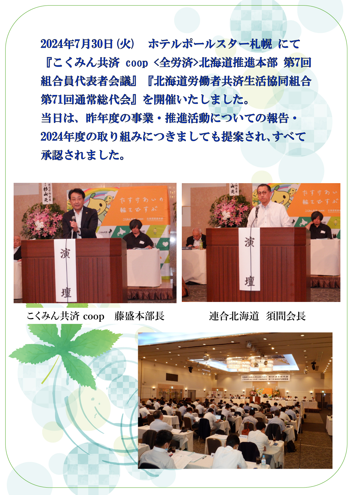 2024年 第71回通常総代会 /こくみん共済 coop 〈全労済〉北海道推進本部 第7回組合員代表者会議 開催報告