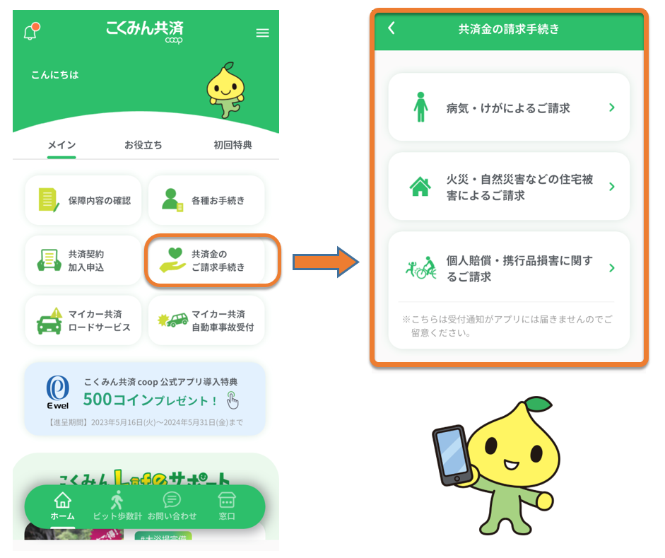 病気やけがによるご請求、火災・自然災害による住宅被害のご請求など、いつでもどこでも共済金の請求手続きが可能です。