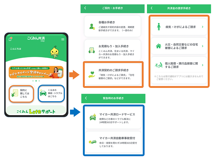 病気やけがによる請求、火災・自然災害による住宅被害の請求、マイカー共済ロードサービス、自動車事故受付など、いつでもどこでも共済金の請求手続きが可能です。