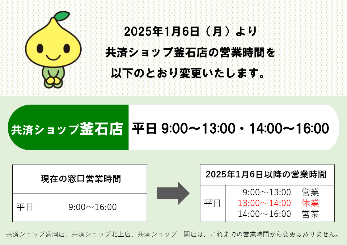共済ショップ釜石店 営業時間変更に関するお知らせ