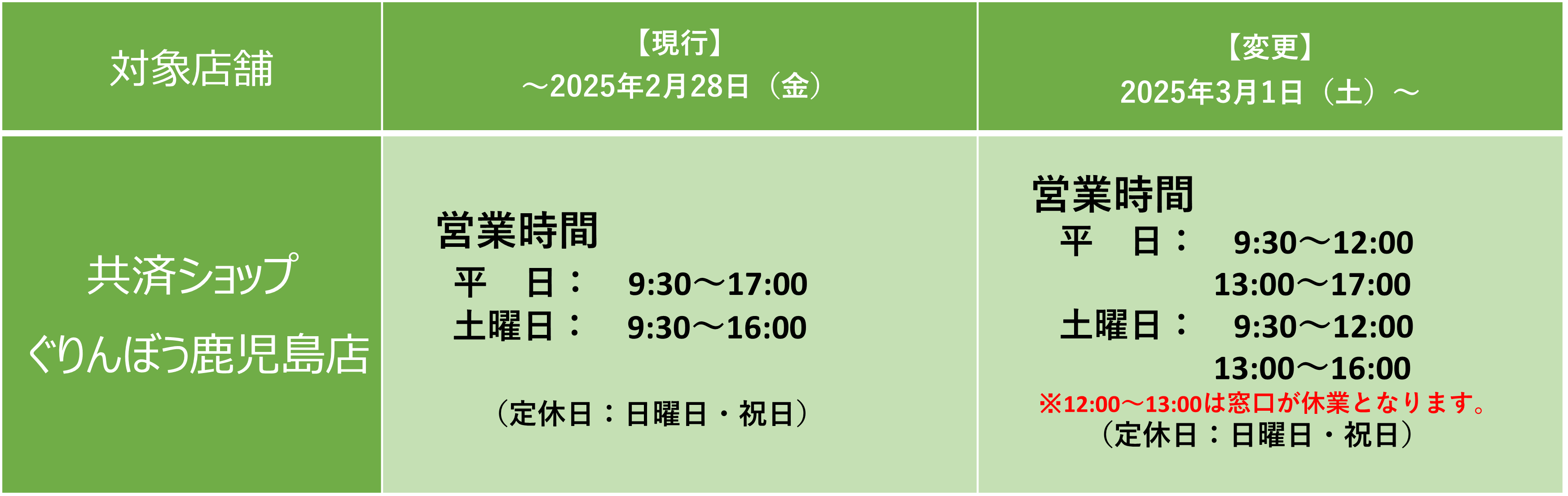 「共済ショップぐりんぼう鹿児島店」は、2025年3月1日(土)より、当面の間、営業時間を変更させていただきます。