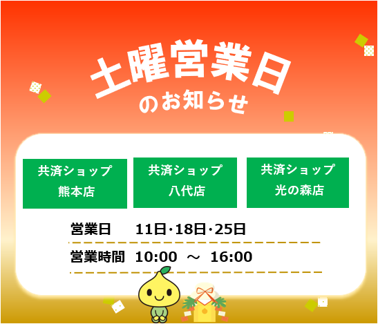 共済ショップ熊本店・八代店・光の森店では、平日だけでなく毎週土曜日も元気に営業しております。