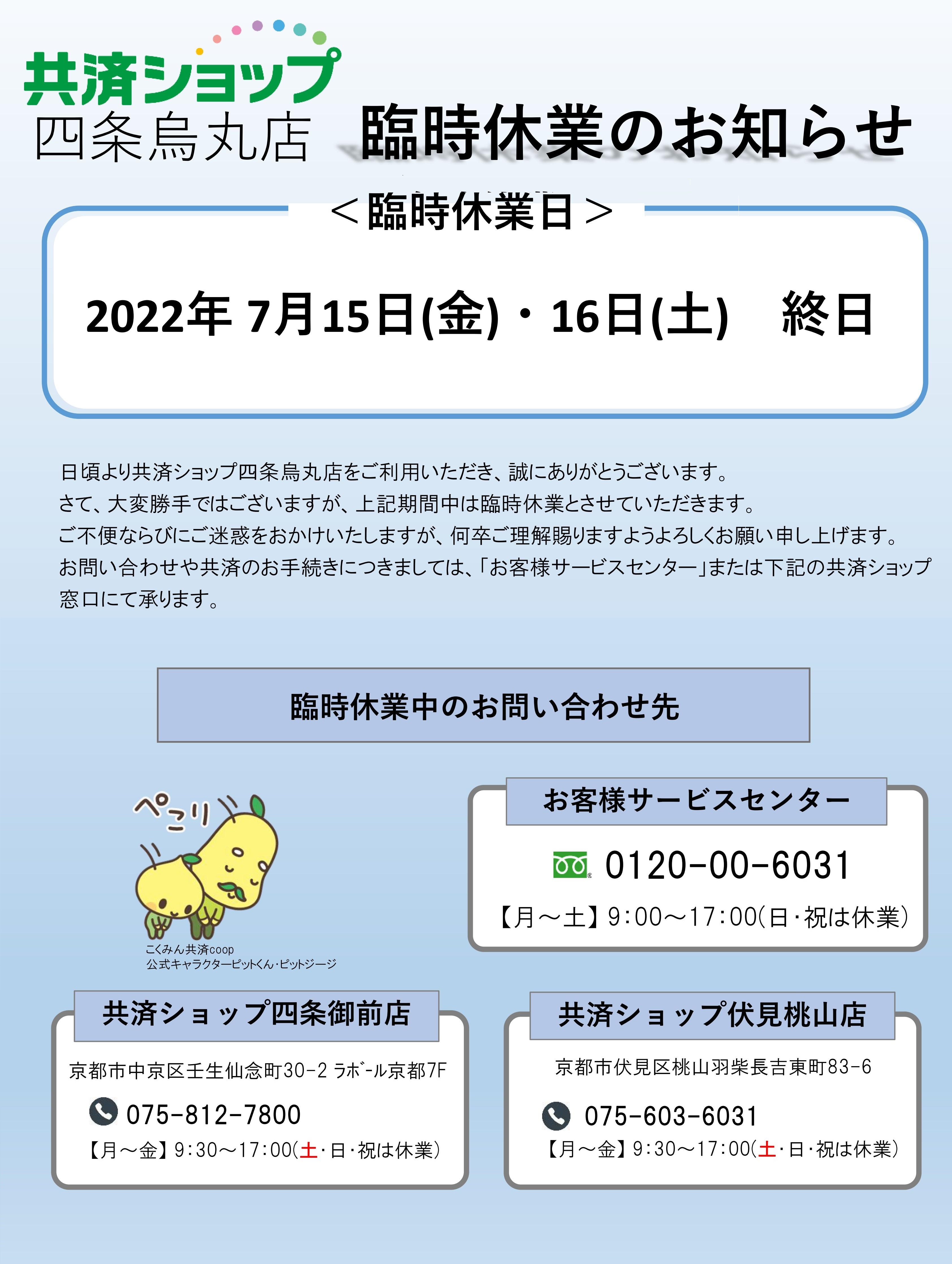 共済ショップ四条烏丸店 臨時休業のお知らせ