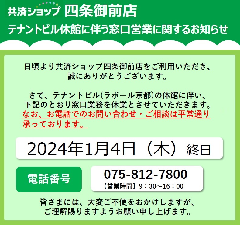共済ショップ四条御前店 テナントビル休館に伴う窓口営業に関するお知らせ