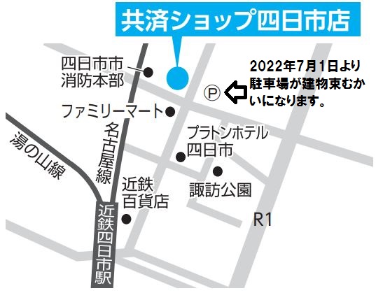 共済ショップ四日市店の駐車場が、2022年7月1日より店舗東側むかいへ移転をいたします。店舗裏側の駐車場は使用できなくなりますので、お間違えのないようお願いします。