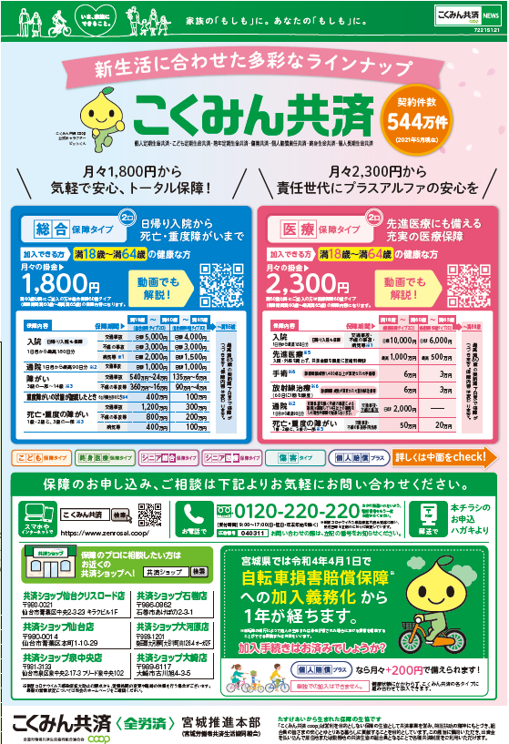 2022年3月5日(土)に、「こくみん共済加入申込書付チラシ」を新聞折り込みいたします(一部地域を除きます)。