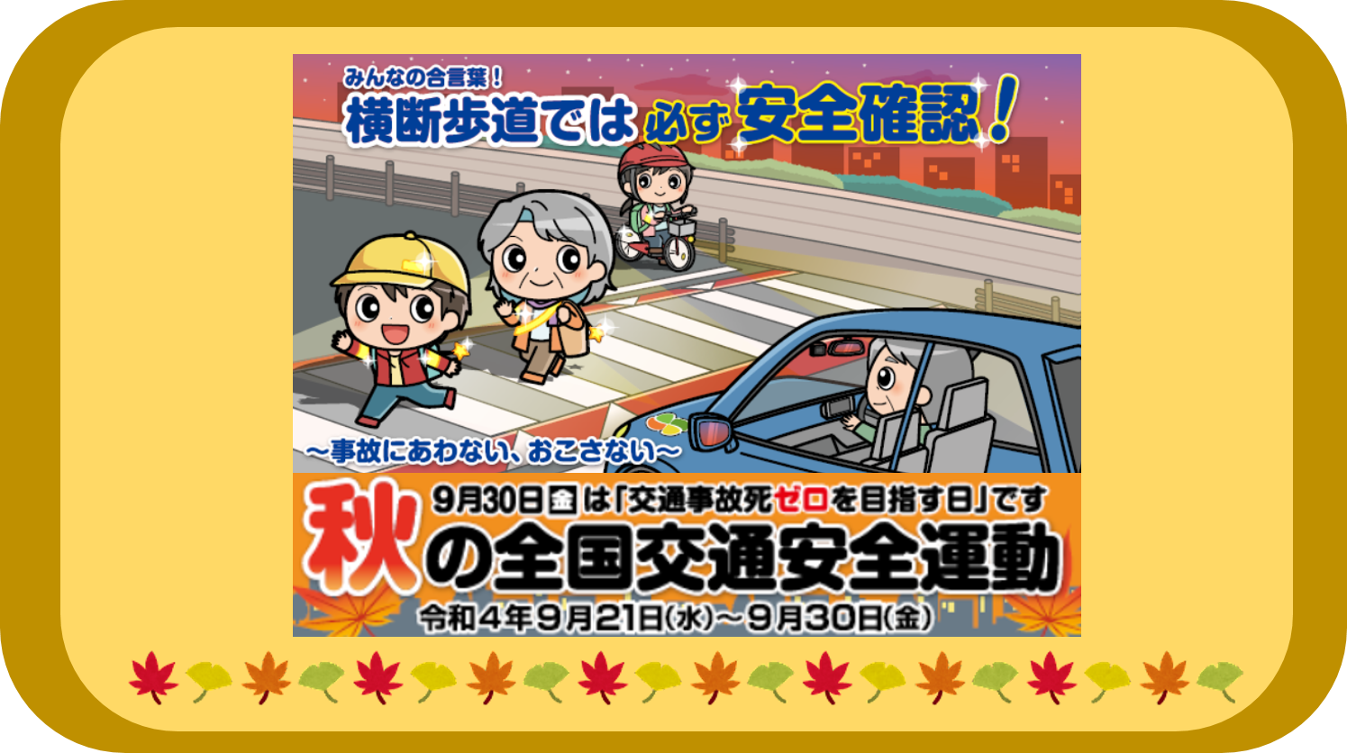 本運動は、全国で交通安全の普及・浸透を図り、交通ルールの尊重と正しい交通交通マナーの実践を習慣づけるとともに、交通事故防止の徹底を図ることを目的としている運動です。ぜひこの機会に交通安全に対する意識を高め、交通事故防止に努めていきましょう!