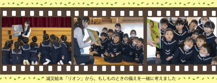 第二部の絵本読み聞かせでは、減災絵本「リオン」を通し、地震や台風、大雪などの急な災害に備えるための