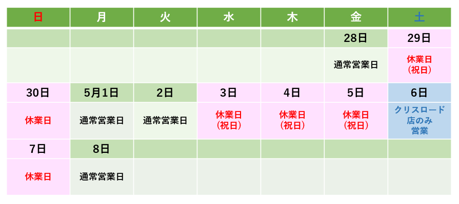 【ゴールデンウィーク期間中の休業日】