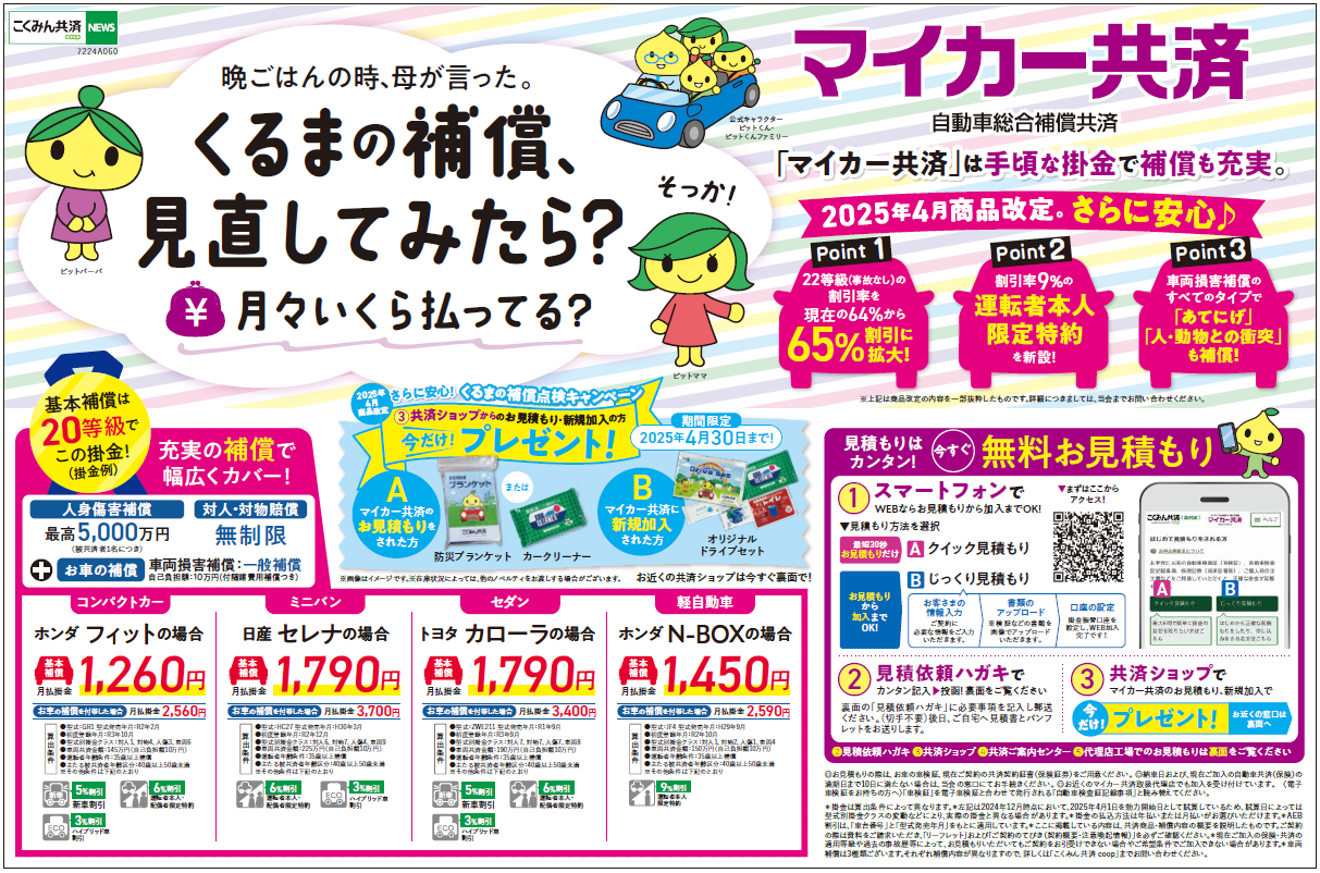 2025年2月1日(土)に、マイカー共済の新聞折り込みを実施しました(一部地域を除きます)。