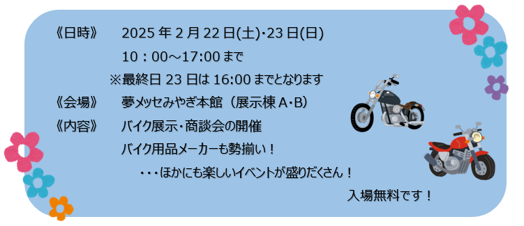 「バイクフェスタ2025in夢メッセみやぎ」が開催されます。