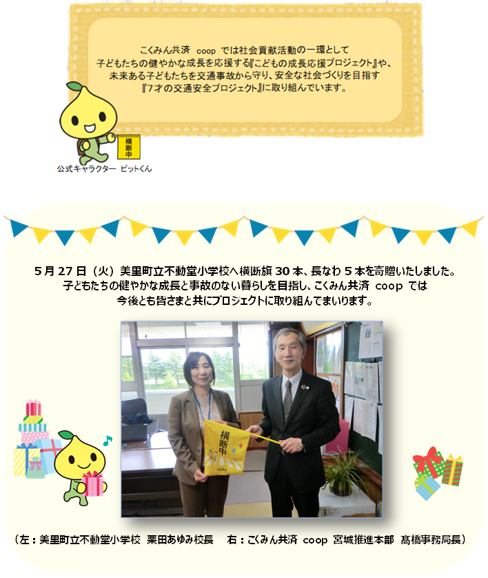 美里町立不動堂小学校へ横断旗を寄贈しました