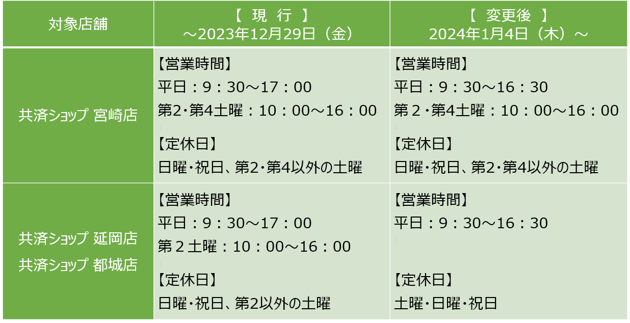 2024年1月より宮崎県内の各共済ショップにつきまして、営業日時を下記のとおり変更させていただきます。
