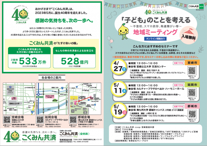 2023年5月にこくみん共済は誕生40周年を迎えました。これまでの皆さまのご協力に感謝を込めて「『子ども』のことを考える地域ミーティング」を開催いたします。