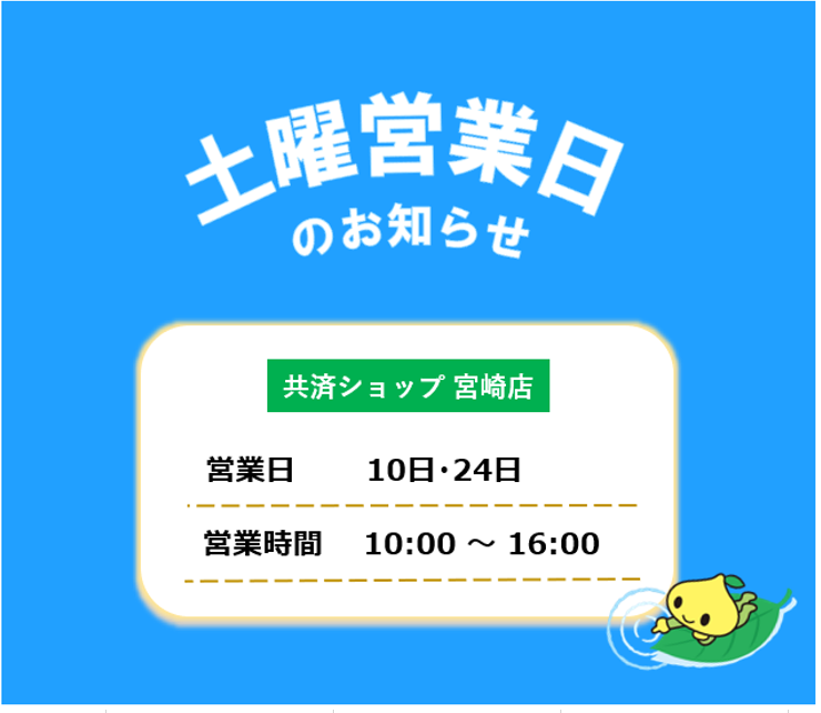 皆さま、こんにちは。 共済ショップ宮崎店では、平日だけでなく第2・4土曜日も元気に営業しております。 お近くにお越しの際は、ぜひ共済ショップへお立ち寄りください。 皆さまのご来店をお待ちしております。