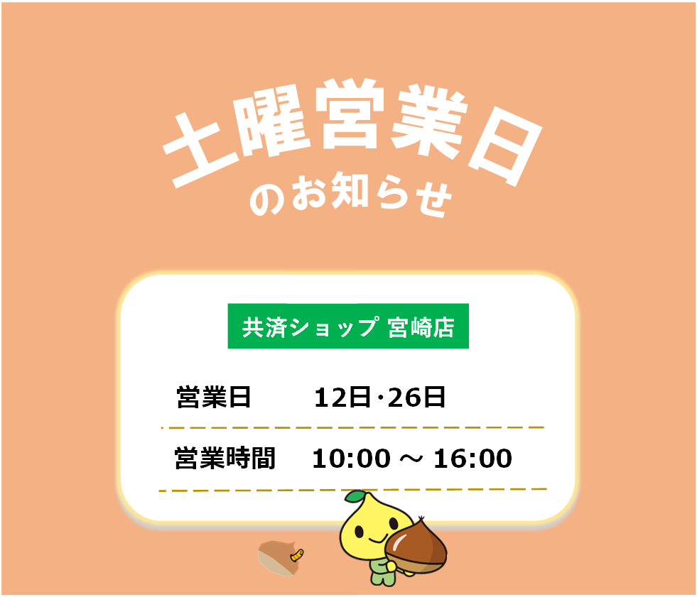 皆さま、こんにちは。 共済ショップ宮崎店では、平日だけでなく第2・4土曜日も元気に営業しております。 お近くにお越しの際は、ぜひ共済ショップへお立ち寄りください。 皆さまのご来店をお待ちしております。