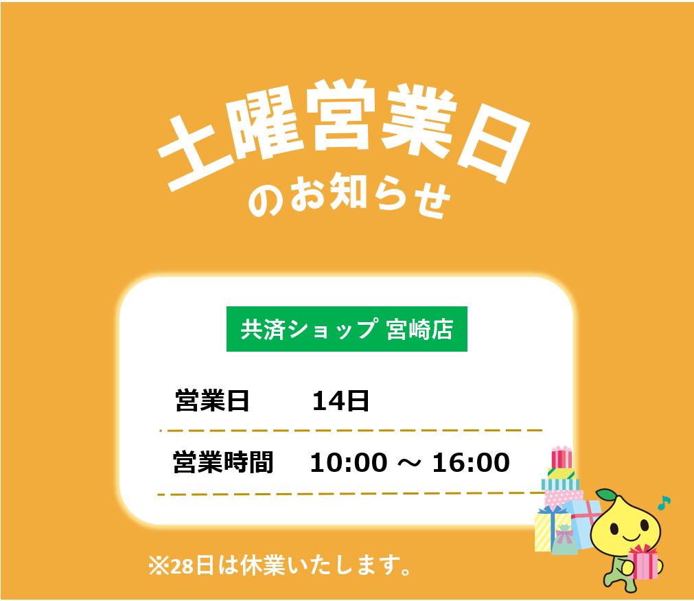 皆さま、こんにちは。 共済ショップ宮崎店では、平日だけでなく第2・4土曜日も元気に営業しております。 お近くにお越しの際は、ぜひ共済ショップへお立ち寄りください。 皆さまのご来店をお待ちしております。
