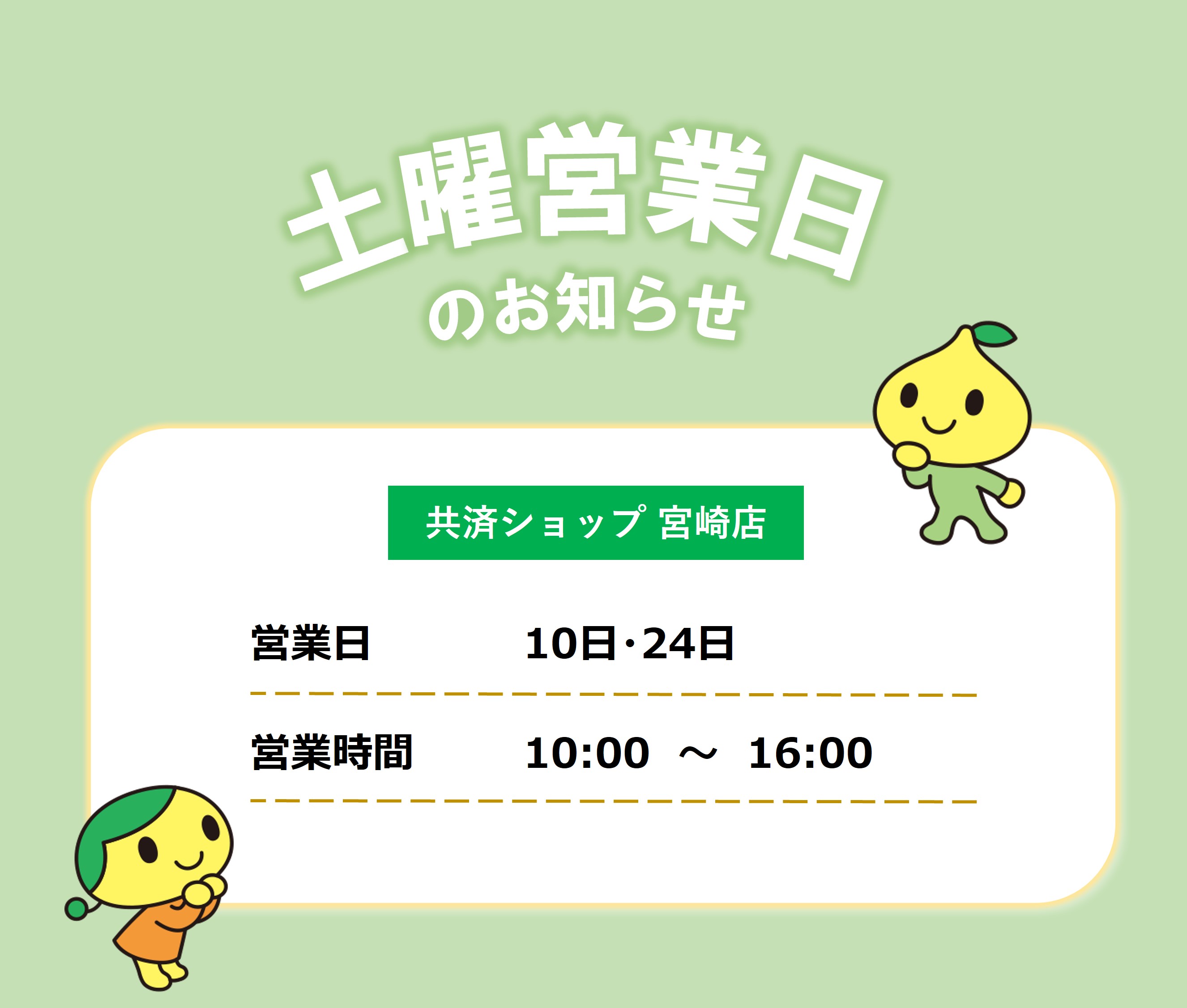 皆さま、こんにちは。 共済ショップ宮崎店では、平日だけでなく第2・4土曜日も元気に営業しております。 お近くにお越しの際は、ぜひ共済ショップへお立ち寄りください。 皆さまのご来店をお待ちしております。