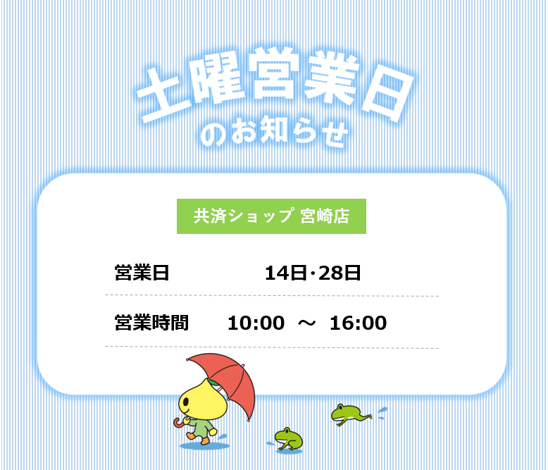 皆さま、こんにちは。 共済ショップ宮崎店では、平日だけでなく第2・4土曜日も元気に営業しております。