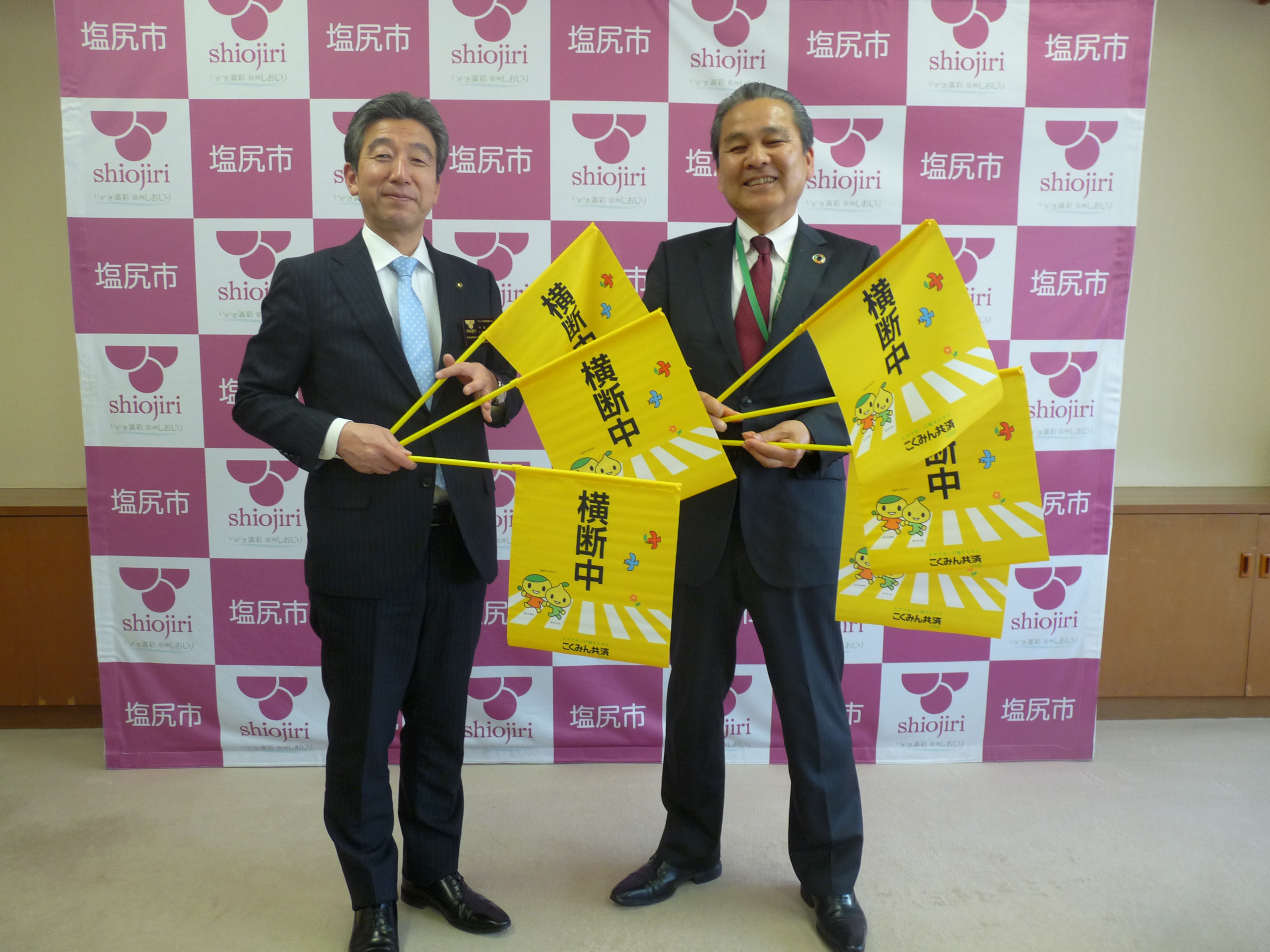 こくみん共済 coop では、そんな想いから、みんなで子どもたちを事故から守っていく「7才の交通安全プロジェクト」に取り組んでいます。プロジェクトの一環として、マイカー共済のお見積もり1件につき横断旗1本を寄贈する取り組みを行っています。 2024年4月11日に塩尻市役所を訪問し、百瀬市長あてに500本の横断旗を寄贈いたしました。