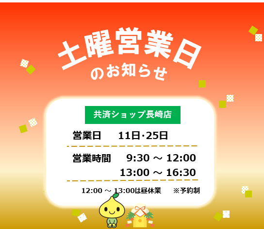 共済ショップ長崎店では、平日だけでなく第2・4土曜日も元気に営業しております。