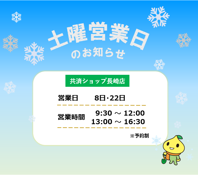 共済ショップ長崎店では、平日だけでなく第2・4土曜日も元気に営業しております。