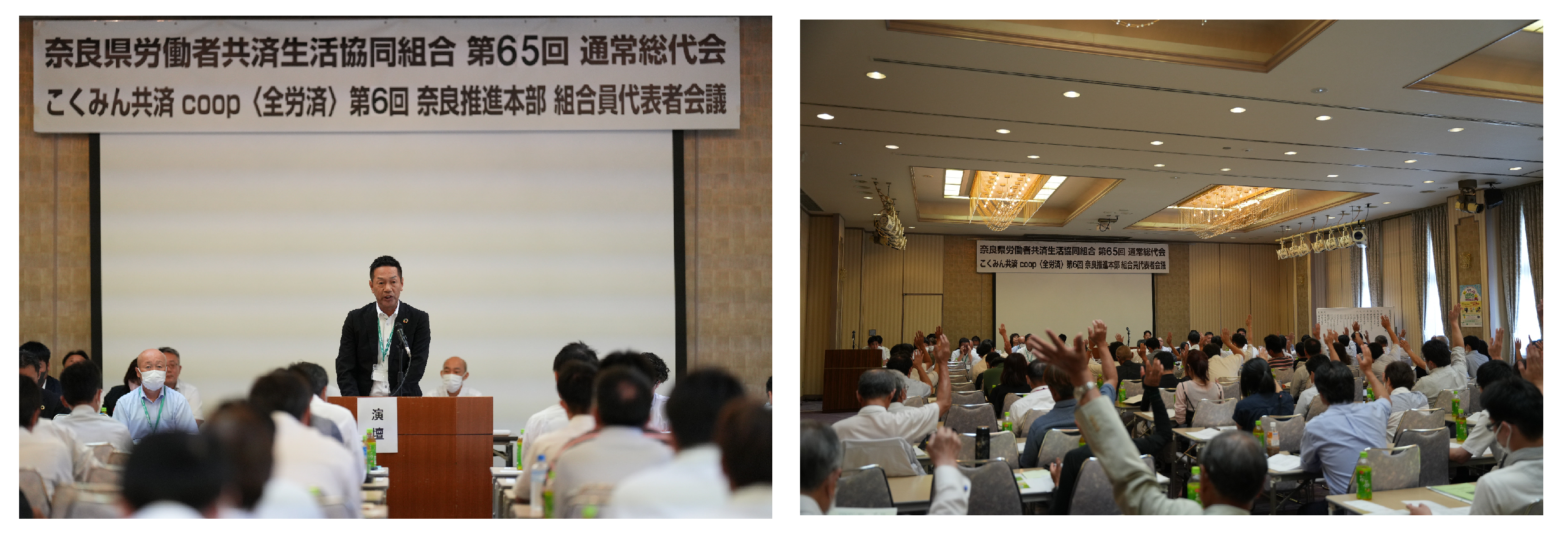 2023年7月31日、ホテル リガーレ春日野において第6回こくみん共済 coop 〈全労済〉奈良推進本部組合員代表者会議を開催しました。2020年からの3年間は、新型コロナウイルス感染症の感染拡大防止のため規模を縮小して開催しておりましたが、今年はコロナ禍前の開催形態で実施し、組合員代表者による討議の結果、すべての議案が承認されました。