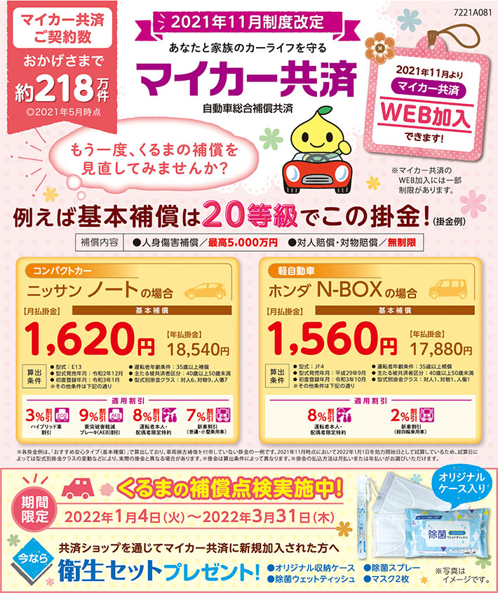 現在、くるまの補償点検を実施中です!2022年1月4日(火)~2022年3月31日(木)の間に、共済ショップにてマイカー共済のお見積もりをいただいた方へ、衛生セットをプレゼント!