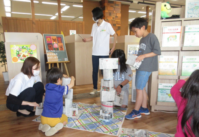 電気や水が使えない、家や避難所では限られたものでしか遊べない状況でも新聞紙や紙コップ、紙皿を