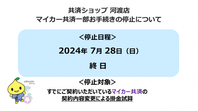 ※ マイカー共済以外のご相談、お手続きは通常通りとなります。