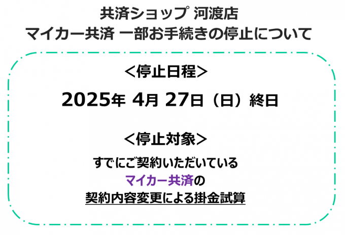 ※ マイカー共済以外のご相談、お手続きは通常通りとなります。