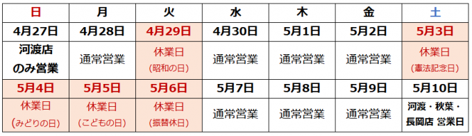 ゴールデンウィーク期間中の営業に関するお知らせ