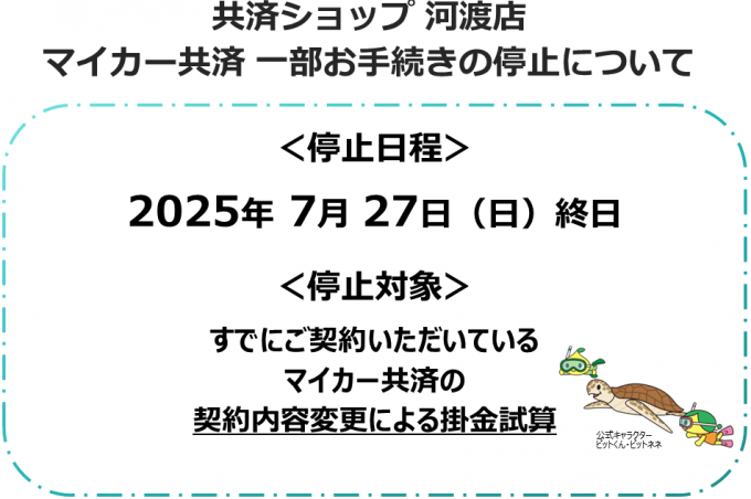 ※ マイカー共済以外のご相談、お手続きは通常通りとなります。