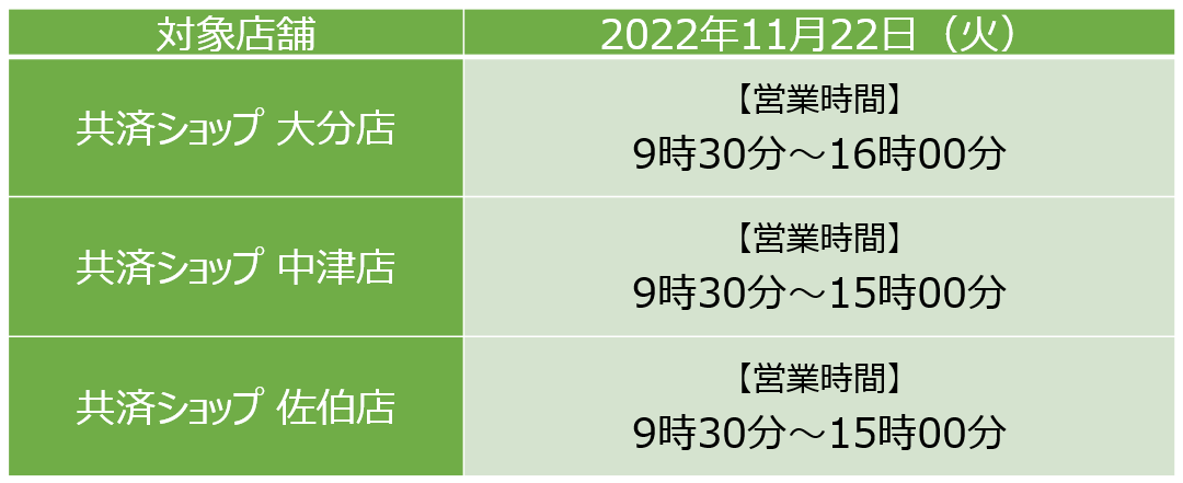 こくみん共済 coop 大分推進本部の各共済ショップ【大分店・中津店・佐伯店】の営業時間は、11月22日(火)につきましては、以下の通りとさせていただきます。
