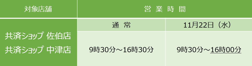 「共済ショップ佐伯店」と「共済ショップ中津店」は、2023年11月22日(水)のみ下記の通り営業時間を変更いたします。