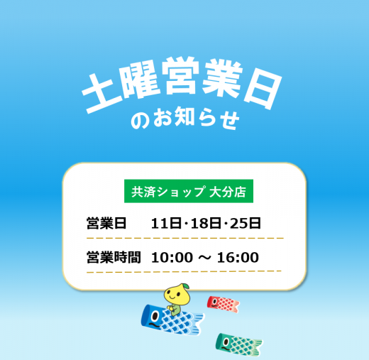 共済ショップ大分店では、5月4日を除いて毎週土曜日も元気に営業しております。