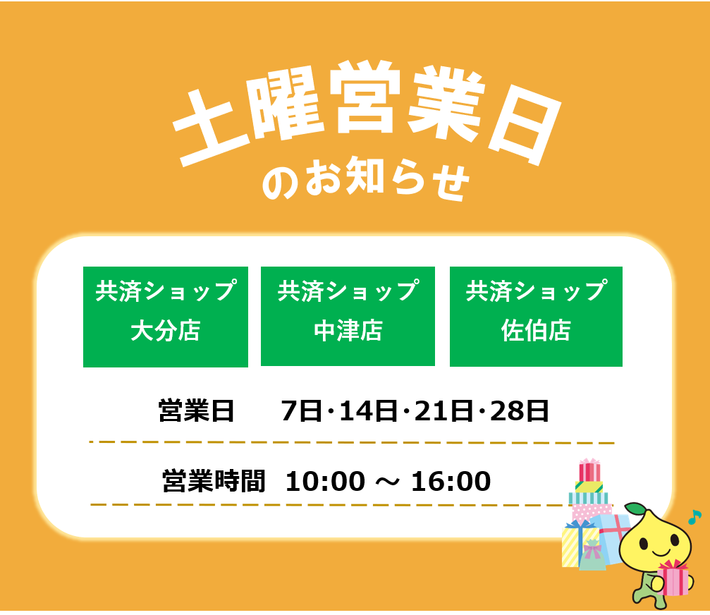 共済ショップ大分店・中津店・佐伯店では、平日だけでなく毎週土曜日も元気に営業しております。