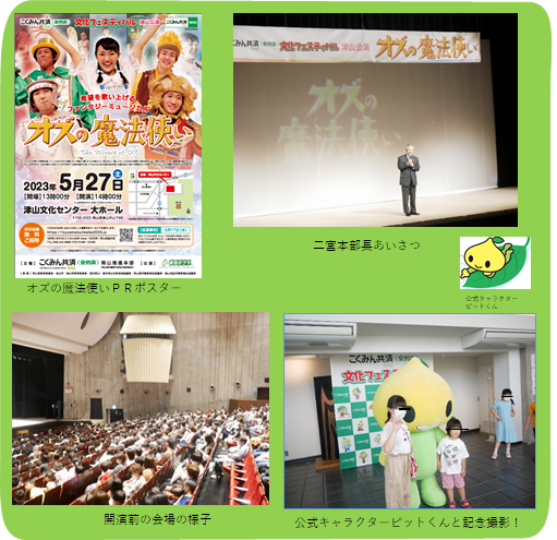 5月27日(土)にこくみん共済 coop 主催 文化フェスティバル津山公演を開催いたしました。文化フェスティバルとは、組合員の皆さまにお楽しみいただきたいという願い、次代を担う子どもたちとそのご家族に、良質な文化芸術に触れ豊かな心を育んでいただきたいという願いを込め「子どもから大人までそれぞれの世代で楽しんで頂ける」をキャッチフレーズに、こくみん共済 coop が開催している文化イベントです。