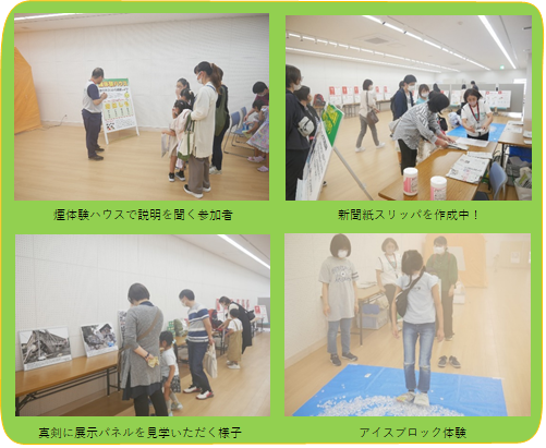 また、ミュージカル公演開演前にが、「防災体験コーナー」を設置させていただき、煙体験ハウスやアイスブロックによるガラスの散乱体験など、100名弱の親子連れの方々にお越しいただき様々な体験をしていただきました。ご参加いただいた方からは、「5年前に真備で水害があったが、津山地区では起こらないだろうと思っていた。しかしいつ災害は起こるかわからないため、他人ごとと思わずに今日この経験を生かして準備をしたい」とか「こんなに煙で視界が見えなくなるとは思わなかった」「ガラスの散乱体験で常日頃から準備をしておく大切さを実感しました」と言ったお声をいただきました。