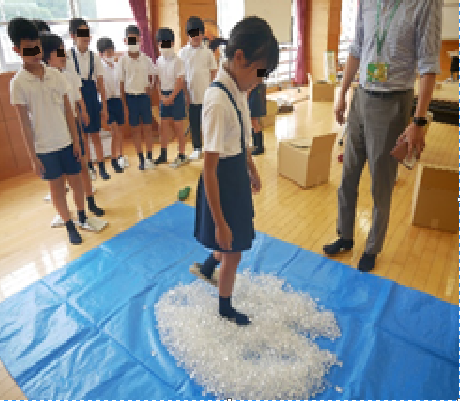 また「ガラスの散乱体験」では、ガラスに見立てたアイスブロックの上を歩いていただき、災害時に素足で歩くことの危険性を体験いただきました。