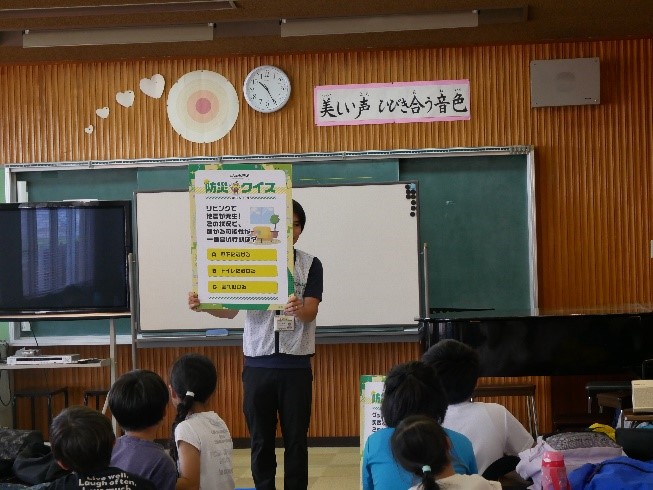 前半は「みんなで挑戦!防災クイズ」を行い、10問のクイズを3班に分かれてみんなで考えました。