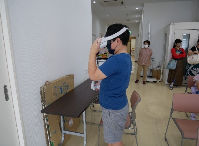後半は防災体験プログラムを行いました。「VRによる災害体験」・「新聞紙スリッパでガラス散乱体験」・「自転車シュミレーターで交通安全」・「ビニール袋で雨合羽作り」・「段ボールトイレ作り」の5つについて体験しながら防災・減災について学んでいただきました。