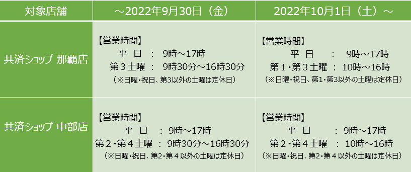県内の共済ショップにつきまして、2022年10月より営業時間を下記の通り変更いたします。