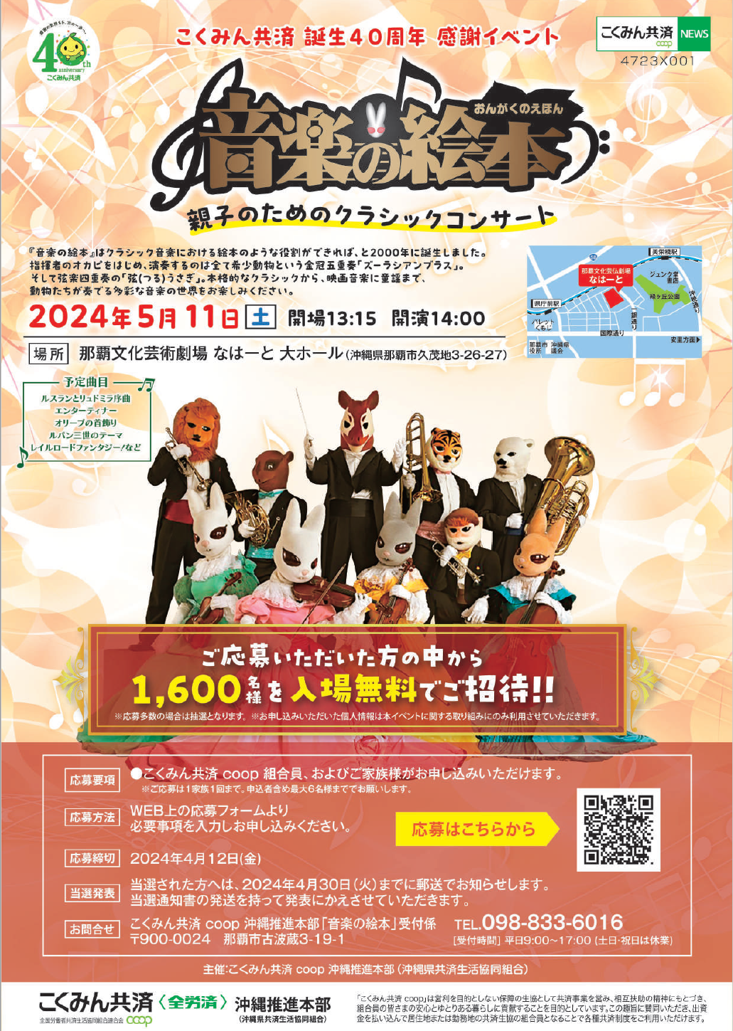 こくみん共済 coop では、組合員の皆さまへ日頃の感謝を伝えるため、こくみん共済誕生40周年感謝イベント「音楽の絵本」を5月11日(土)に「那覇文化芸術劇場 なはーと 大ホール」にて開催いたします。