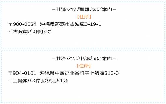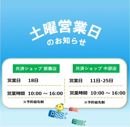 平日だけでなく、共済ショップ那覇店では第1・3土曜日、中部店では第2・4土曜日も元気に営業しております。