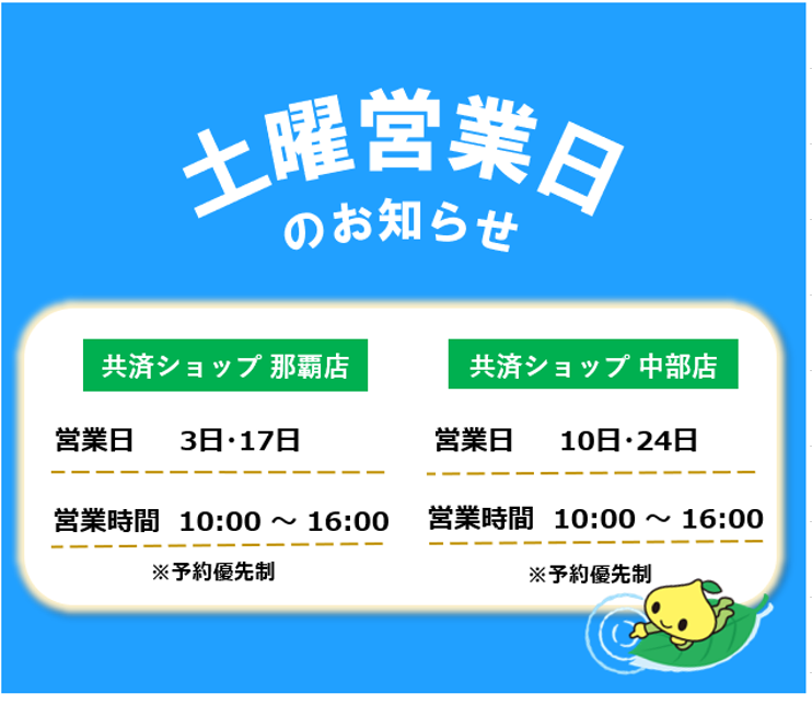 平日だけでなく共済ショップ那覇店では第1・第3土曜日、共済ショップ中部店では第2・第4土曜日も元気に営業しております。